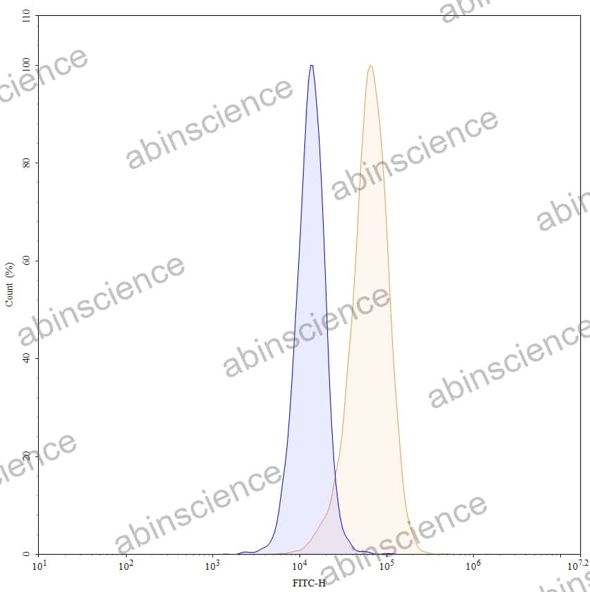 Flow-cytometry using FITC anti-human CD146 antibody. Hela cells were stained with an irrelevant antibody (Blue Histogram) or an FITC anti-human CD146 monoclonal antibody (Catalog: HW484117, Yellow Histogram) at a concentration of 5 µg/ml for 30 mins at RT. After washing, and cells analysed on a NovoCyte Flow Cytometer.