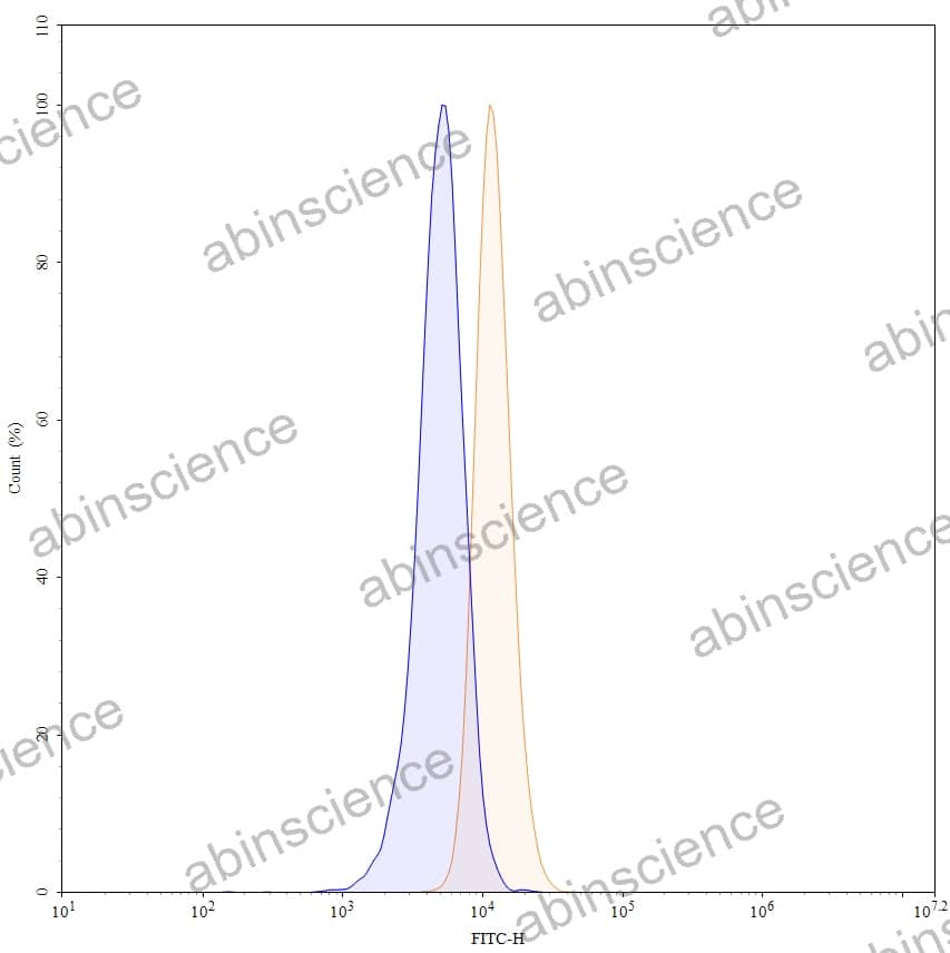 Flow-cytometry using FITC anti-human CD172a antibody. U937 cells were stained with an irrelevant antibody (Blue Histogram) or an FITC anti-human CD172a monoclonal antibody (Catalog: HX892117, Yellow Histogram) at a concentration of 5 µg/ml for 30 mins at RT. After washing, and cells analysed on a NovoCyte Flow Cytometer. |