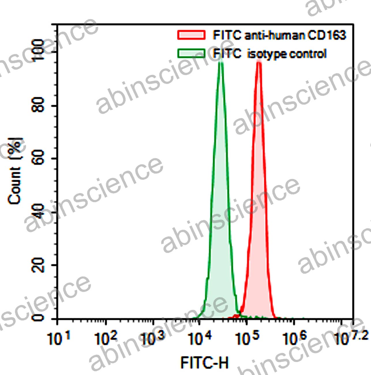 Flow-cytometry using FITC anti-Human CD163 antibody. CACO-2 cells were stained with an irrelevant antibody (Green Histogram) or a FITC anti-Human CD163 antibody monoclonal antibody (Catalog # HV831217 , Red Histogram) at a concentration of 5 µg/ml for 30 mins at RT. After washing, cells analysed on a NovoCyte Flow Cytometer. |