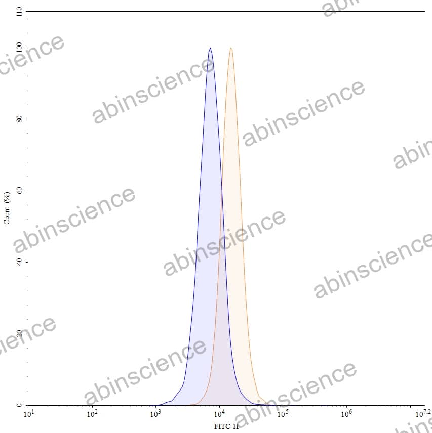 Flow-cytometry using FITC anti-human CD318 antibody. HT-29 cells were stained with an irrelevant antibody (Blue Histogram) or an FITC anti-human CD318 monoclonal antibody (Catalog: HV451117, Yellow Histogram) at a concentration of 5 µg/ml for 30 mins at RT. After washing, cells analysed on a NovoCyte Flow Cytometer.