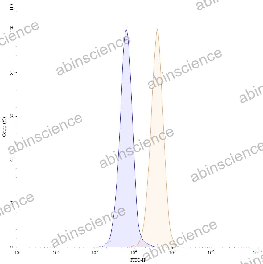 Flow-cytometry using FITC anti-human CD274 antibody. MDA-MB-231 cells were stained with an irrelevant antibody (Blue Histogram) or an FITC anti-human CD274 monoclonal antibody (Catalog: HV974117, Yellow Histogram) at a concentration of 5 µg/ml for 30 mins at RT. After washing, cells analysed on a NovoCyte Flow Cytometer. |