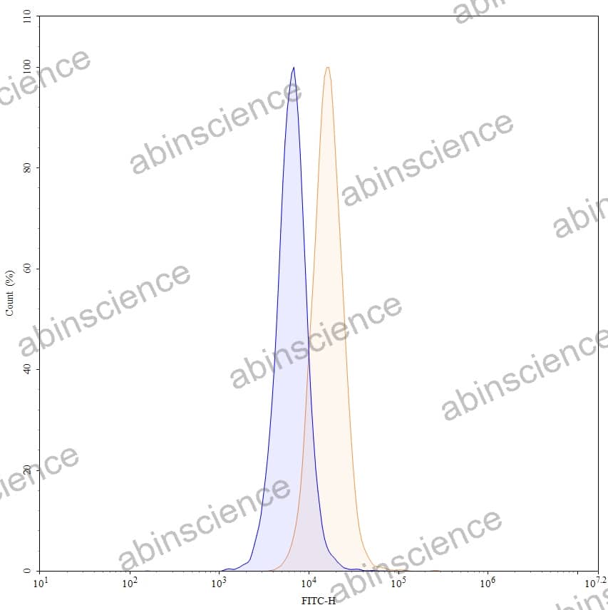 Flow-cytometry using FITC anti-human CD274 antibody. MDA-MB-231 cells were stained with an irrelevant antibody (Blue Histogram) or an FITC anti-human CD274 monoclonal antibody (Catalog: MV974217, Yellow Histogram) at a concentration of 5 µg/ml for 30 mins at RT. After washing, cells analysed on a NovoCyte Flow Cytometer. |