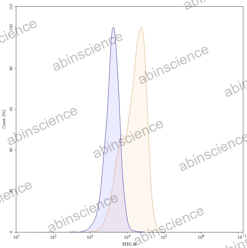 Flow-cytometry using FITC anti-human TRBC1 antibody. Jurkat cells were stained with an irrelevant antibody (Blue Histogram) or an FITC anti-human TRBC1 monoclonal antibody (Catalog: HP894117, Yellow Histogram) at a concentration of 5 µg/ml for 30 mins at RT. After washing, cells analysed on a NovoCyte Flow Cytometer.