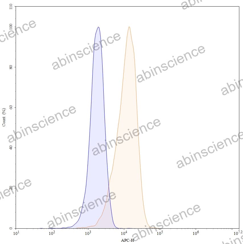 Flow-cytometry using APC anti-human CD275 antibody. U937 cells were stained with an irrelevant antibody (Blue Histogram) or an APC anti-human CD275 monoclonal antibody (Catalog: HF564137, Yellow Histogram) at a concentration of 5 µg/ml for 30 mins at RT. After washing, cells analysed on a NovoCyte Flow Cytometer. |
