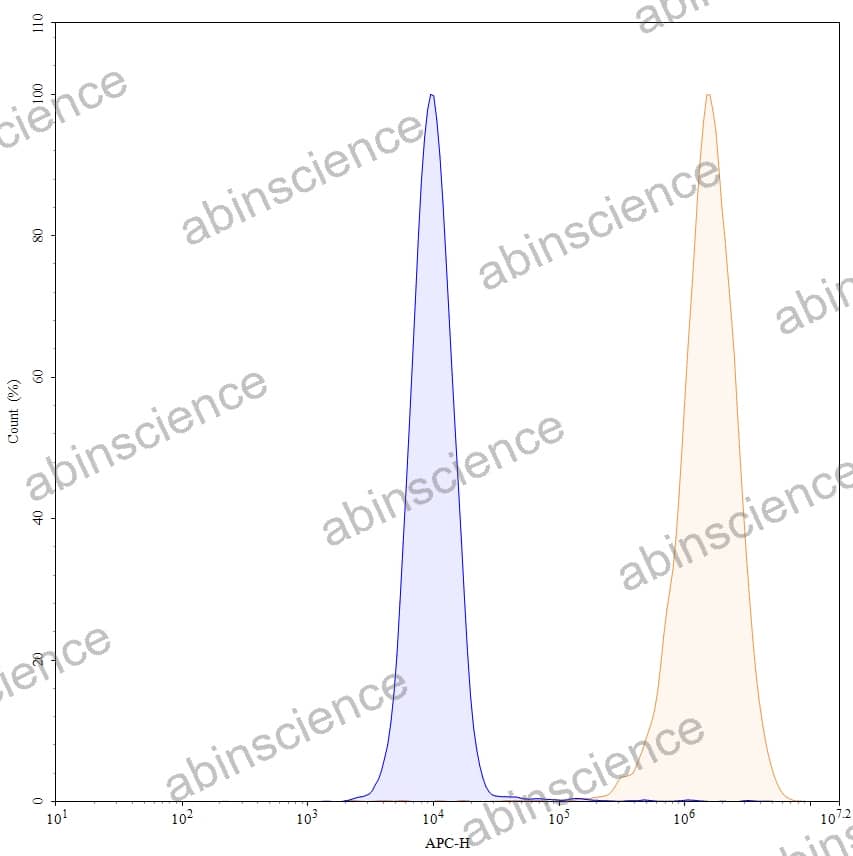 Flow-cytometry using APC anti-human EGFR antibody. A431 cells were stained with an irrelevant antibody (Blue Histogram) or an APC anti-human EGFR monoclonal antibody (Catalog: HF004337, Yellow Histogram) at a concentration of 5 µg/ml for 30 mins at RT. After washing, and cells analysed on a NovoCyte Flow Cytometer.