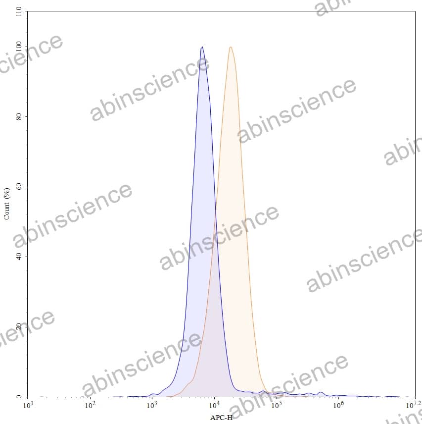 Flow-cytometry using APC anti-human CD98 antibody. Hela cells were stained with an irrelevant antibody (Blue Histogram) or an APC anti-human CD98 monoclonal antibody (Catalog: HY415137, Yellow Histogram) at a concentration of 5 µg/ml for 30 mins at RT. After washing, cells analysed on a NovoCyte Flow Cytometer. |