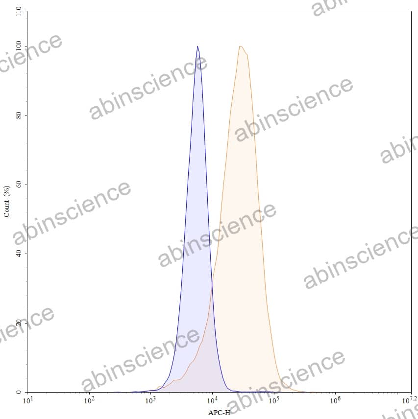 Flow-cytometry using APC anti-human CD7 antibody. Jurkat cells were stained with an irrelevant antibody (Blue Histogram) or an APC anti-human CD7 monoclonal antibody (Catalog: HY302237, Yellow Histogram) at a concentration of 5 µg/ml for 30 mins at RT. After washing, cells analysed on a NovoCyte Flow Cytometer. |