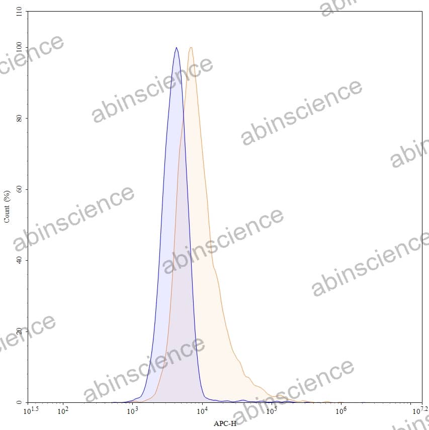 Flow-cytometry using APC anti-human CD227 antibody. MCF-7 cells were stained with an irrelevant antibody (Blue Histogram) or an APC anti-human CD227 monoclonal antibody (Catalog: HB102137, Yellow Histogram) at a concentration of 5 µg/ml for 30 mins at RT. After washing, and cells analysed on a NovoCyte Flow Cytometer. |