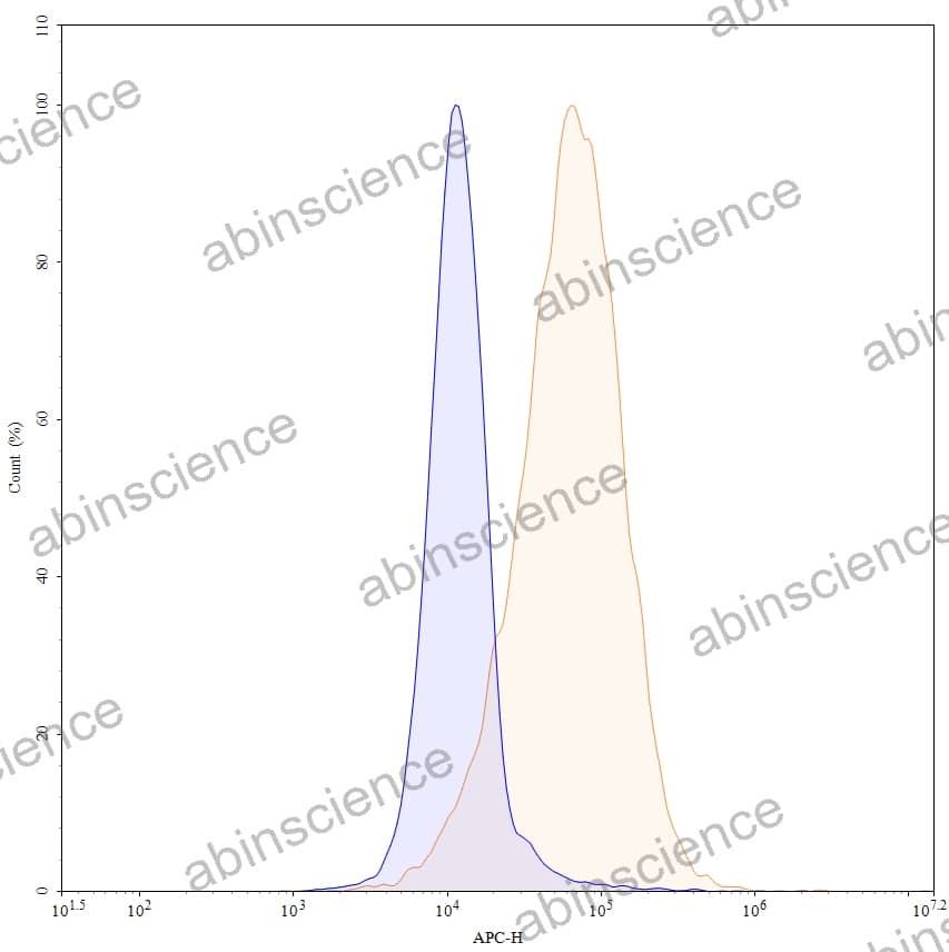 Flow-cytometry using APC anti-human CD73 antibody. U87 cells were stained with an irrelevant antibody (Blue Histogram) or an APC anti-human CD73 monoclonal antibody (Catalog: HB209337, Yellow Histogram) at a concentration of 5 µg/ml for 30 mins at RT. After washing, and cells analysed on a NovoCyte Flow Cytometer.