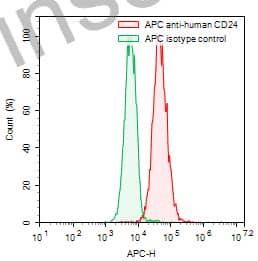 Flow-cytometry using APC anti-human CD24 antibody. SK-BR-3 cells were stained with an irrelevant antibody (Green Histogram) or an APC anti-human CD24 antibody monoclonal antibody (Catalog # HB630137, Red Histogram) at a concentration of 5 µg/ml for 30 mins at RT. After washing, cells analysed on a NovoCyte Flow Cytometer. |