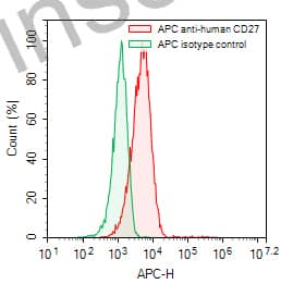 Flow-cytometry using APC anti-human CD27 antibody. Raji cells were stained with an irrelevant antibody (Green Histogram) or an APC anti-human CD27 antibody monoclonal antibody (Catalog # HB796137, Red Histogram) at a concentration of 5 µg/ml for 30 mins at RT. After washing, cells analysed on a NovoCyte Flow Cytometer.