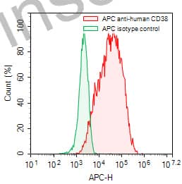 Flow-cytometry using APC anti-human CD38 antibody. RPMI-8226 cells were stained with an irrelevant antibody (Green Histogram) or an APC anti-human CD38 antibody monoclonal antibody (Catalog # HB691137, Red Histogram) at a concentration of 5 µg/ml for 30 mins at RT. After washing, cells analysed on a NovoCyte Flow Cytometer.