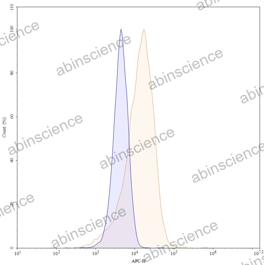 Flow-cytometry using APC anti-human CD30 antibody. Jurkat cells were stained with an irrelevant antibody (Blue Histogram) or an APC anti-human CD30 monoclonal antibody (Catalog: HB038437, Yellow Histogram) at a concentration of 5 µg/ml for 30 mins at RT. After washing, and cells analysed on a NovoCyte Flow Cytometer. |