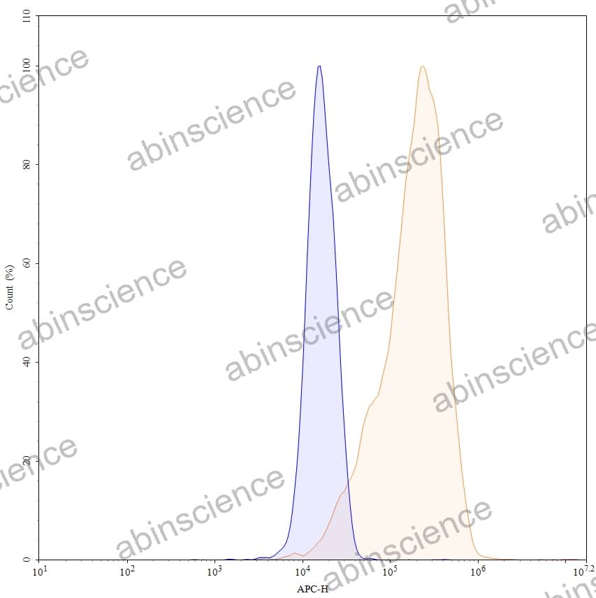 Flow-cytometry using APC anti-human CTGF antibody. MG-63 cells were fixed and permeabilized, then stained with an irrelevant antibody (Blue Histogram) or an APC anti-human CTGF monoclonal antibody (Catalog: HB719137, Yellow Histogram) at a concentration of 5 µg/ml for 30 mins at RT. After washing, cells analysed on a NovoCyte Flow Cytometer. |