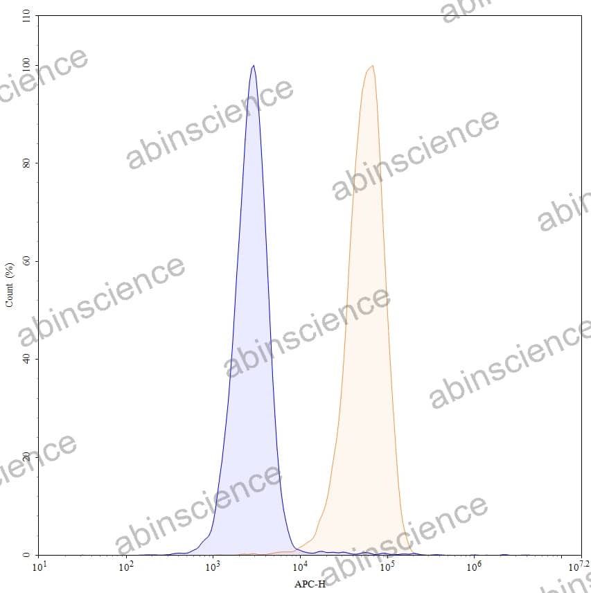 Flow-cytometry using APC anti-human CD32b antibody. Raji cells were stained with an irrelevant antibody (Blue Histogram) or an APC anti-human CD32b monoclonal antibody (Catalog: HB103237, Yellow Histogram) at a concentration of 5 µg/ml for 30 mins at RT. After washing, cells analysed on a NovoCyte Flow Cytometer. |