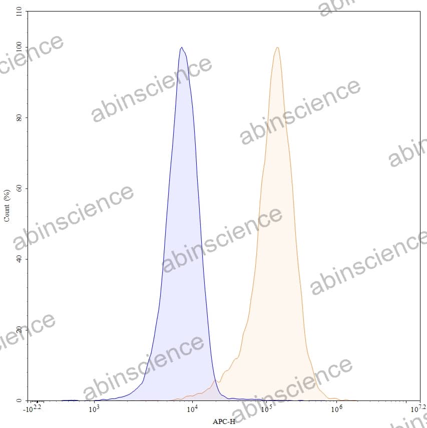 Flow-cytometry using APC anti-human CD49a antibody. Hela cells were stained with an irrelevant antibody (Blue Histogram) or an APC anti-human CD49a monoclonal antibody (Catalog: HX227137, Yellow Histogram) at a concentration of 5 µg/ml for 30 mins at RT. After washing, and cells analysed on a NovoCyte Flow Cytometer. |