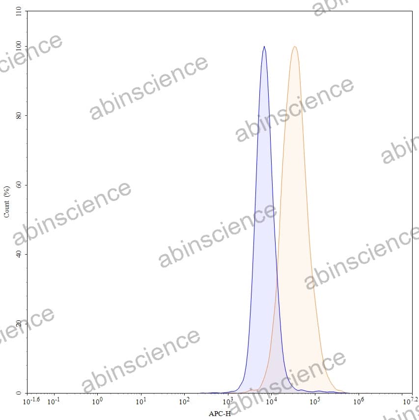 Flow-cytometry using APC anti-human CD339 antibody. HepG-2 cells were stained with an irrelevant antibody (Blue Histogram) or an APC anti-human CD339 monoclonal antibody (Catalog: HX118137, Yellow Histogram) at a concentration of 5 µg/ml for 30 mins at RT. After washing, and cells analysed on a NovoCyte Flow Cytometer. |