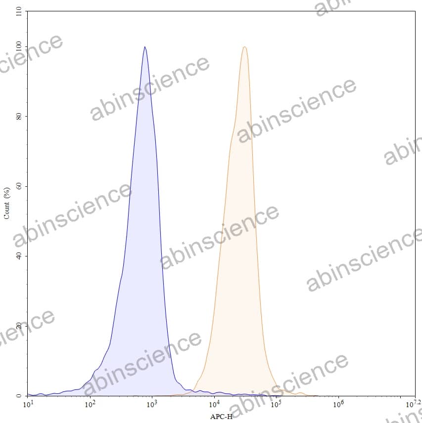 Flow-cytometry using APC anti-Mouse CD47 antibody. Mouse spleen cells were stained with an irrelevant antibody (Blue Histogram) or an APC anti-Mouse CD47 monoclonal antibody (Catalog: MC359137, Yellow Histogram) at a concentration of 5 µg/ml for 30 mins at RT. After washing, cells analysed on a NovoCyte Flow Cytometer. |