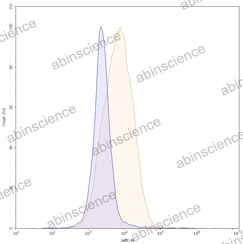 Flow-cytometry using APC anti-human CD166 antibody. SH-SY5Y cells were stained with an irrelevant antibody (Blue Histogram) or an APC anti-human CD166 monoclonal antibody (Catalog: HC678137, Yellow Histogram) at a concentration of 5 µg/ml for 30 mins at RT. After washing, and cells analysed on a NovoCyte Flow Cytometer. |