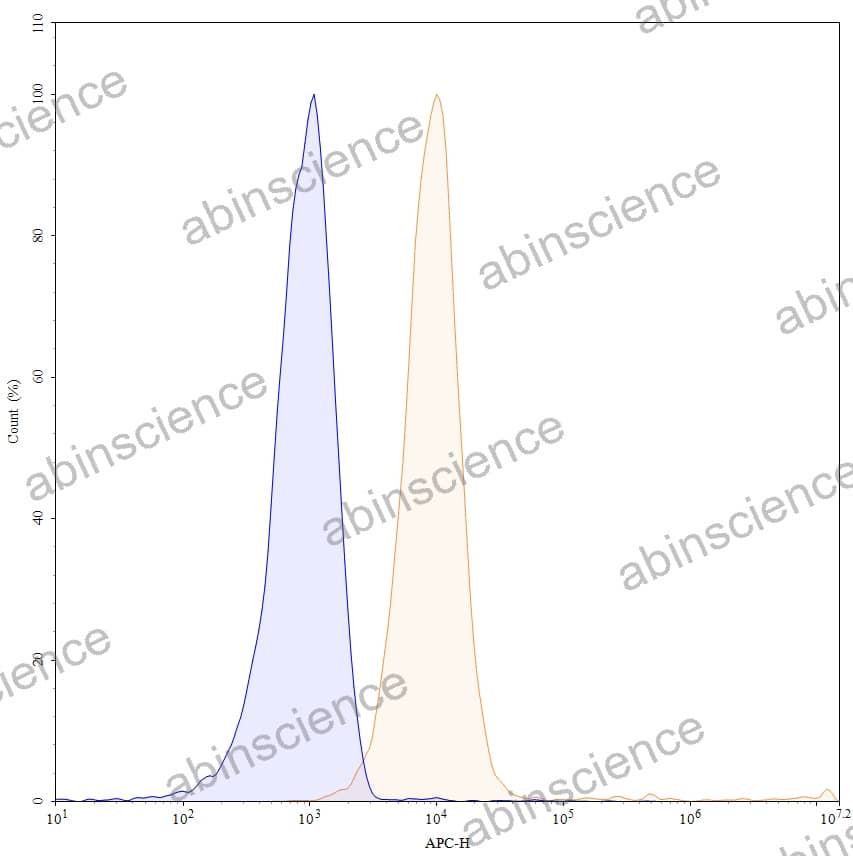 Flow-cytometry using APC anti-human SLC1A5 antibody. Jurkat cells were stained with an irrelevant antibody (Blue Histogram) or an APC anti-human SLC1A5 monoclonal antibody (Catalog: HS734137, Yellow Histogram) at a concentration of 5 µg/ml for 30 mins at RT. After washing, and cells analysed on a NovoCyte Flow Cytometer. |
