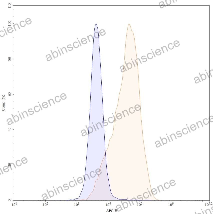 Flow-cytometry using APC anti-human CD266 antibody. U251 cells were stained with an irrelevant antibody (Blue Histogram) or an APC anti-human CD266 monoclonal antibody (Catalog: HV811137, Yellow Histogram) at a concentration of 5 µg/ml for 30 mins at RT. After washing, cells analysed on a NovoCyte Flow Cytometer.