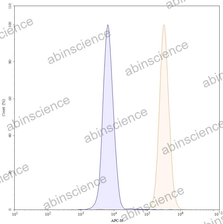 Flow-cytometry using APC anti-human HLA-A,B,C Monomorphic antibody. A431 cells were stained with an irrelevant antibody (Blue Histogram) or an APC anti-human HLA-A,B,C Monomorphic monoclonal antibody (Catalog: HM834137, Yellow Histogram) at a concentration of 5 µg/ml for 30 mins at RT. After washing, and cells analysed on a NovoCyte Flow Cytometer. |