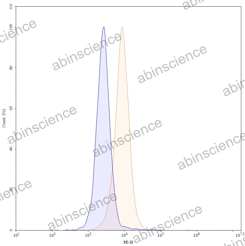 | Flow-cytometry using PE anti-human CD275 antibody. U937 cells were stained with an irrelevant antibody (Blue Histogram) or an PE anti-human CD275 monoclonal antibody (Catalog: HF564127, Yellow Histogram) at a concentration of 5 µg/ml for 30 mins at RT. After washing, and cells analysed on a NovoCyte Flow Cytometer. |