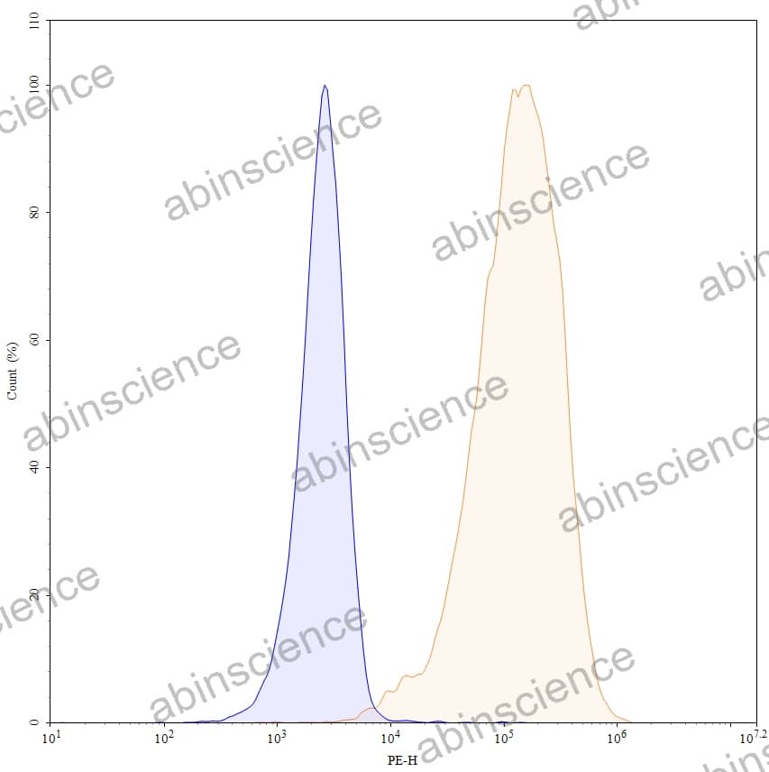 Flow-cytometry using PE anti-human CD71 antibody. U937 cells were stained with an irrelevant antibody (Blue Histogram) or an PE anti-human CD71 monoclonal antibody (Catalog: HY036227, Yellow Histogram) at a concentration of 5 µg/ml for 30 mins at RT. After washing, and cells analysed on a NovoCyte Flow Cytometer. |