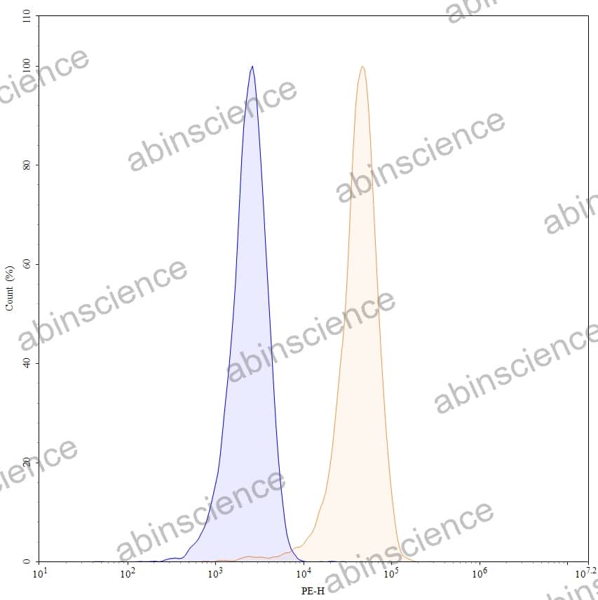 Flow-cytometry using PE anti-human CD18 antibody. Jurkat cells were stained with an irrelevant antibody (Blue Histogram) or an PE anti-human CD18 monoclonal antibody (Catalog: HY378127, Yellow Histogram) at a concentration of 5 µg/ml for 30 mins at RT. After washing, and cells analysed on a NovoCyte Flow Cytometer. |