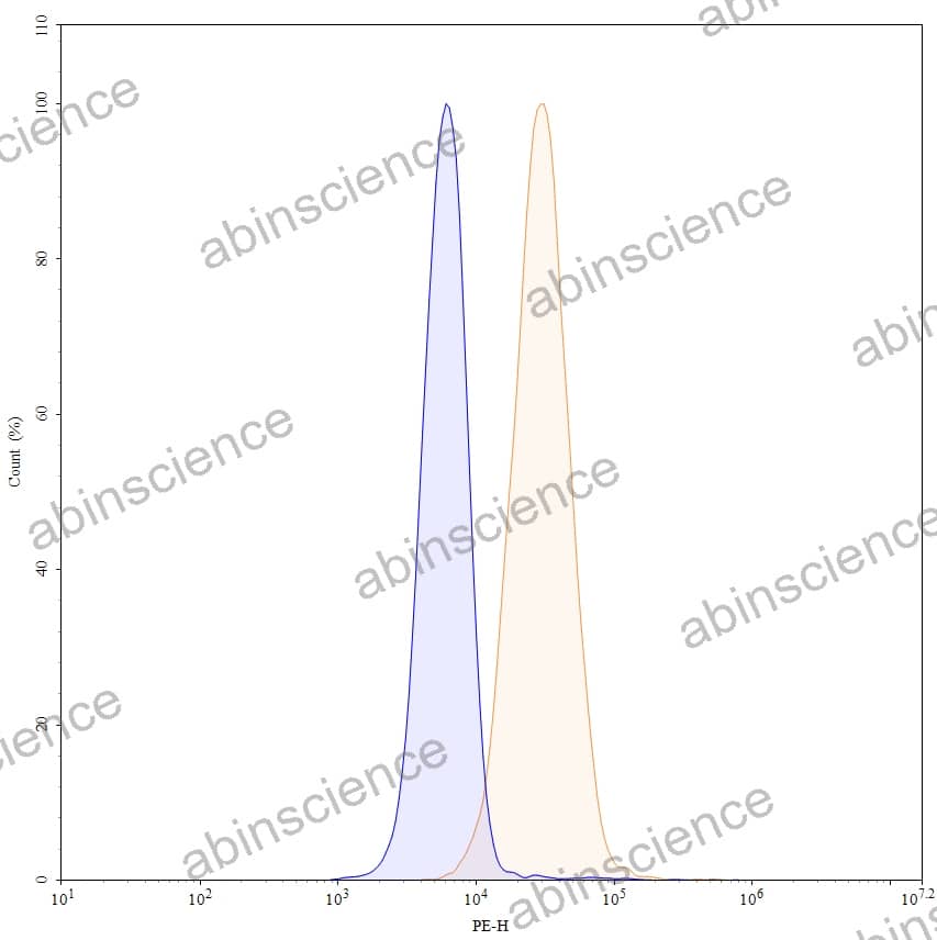 Flow-cytometry using PE anti-human CD220 antibody. MCF-7 cells were stained with an irrelevant antibody (Blue Histogram) or an PE anti-human CD220 monoclonal antibody (Catalog: HY112127, Yellow Histogram) at a concentration of 5 µg/ml for 30 mins at RT. After washing, and cells analysed on a NovoCyte Flow Cytometer.