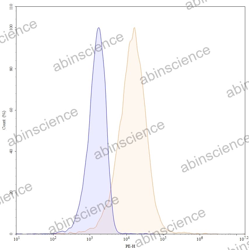 Flow-cytometry using PE anti-human CD3E antibody. Jurkat cells were stained with an irrelevant antibody (Blue Histogram) or an PE anti-human CD3E monoclonal antibody (Catalog: HY057327, Yellow Histogram) at a concentration of 5 µg/ml for 30 mins at RT. After washing, and cells analysed on a NovoCyte Flow Cytometer. |
