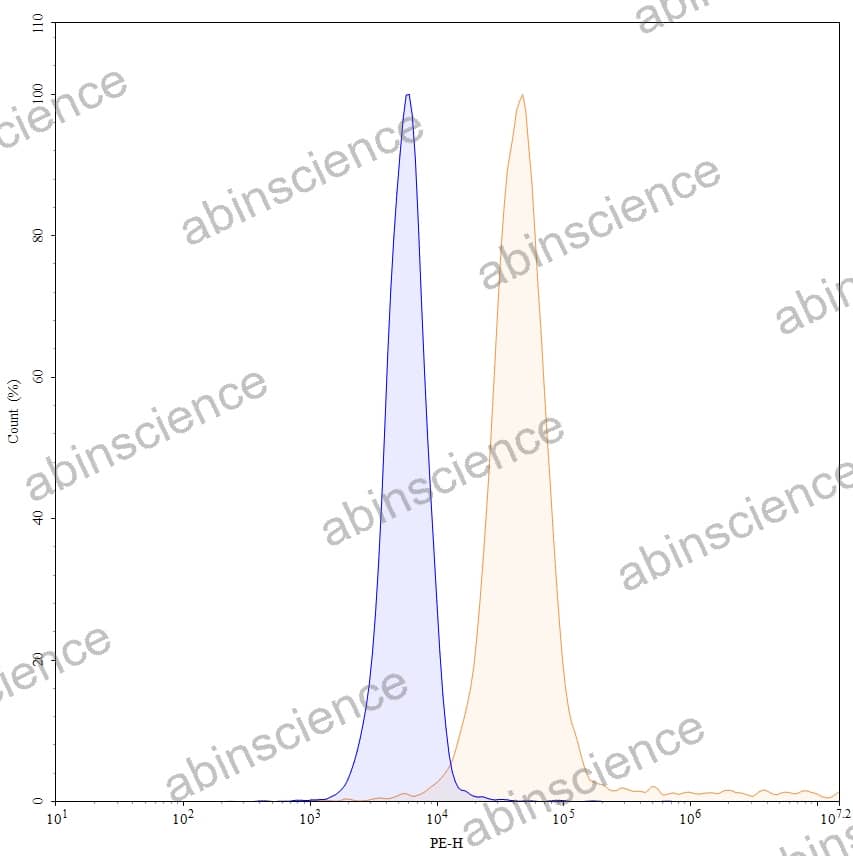 Flow-cytometry using PE anti-human CD49e antibody. HUVEC cells were stained with an irrelevant antibody (Blue Histogram) or an PE anti-human CD49e monoclonal antibody (Catalog: HY464127, Yellow Histogram) at a concentration of 5 µg/ml for 30 mins at RT. After washing, cells analysed on a NovoCyte Flow Cytometer. |