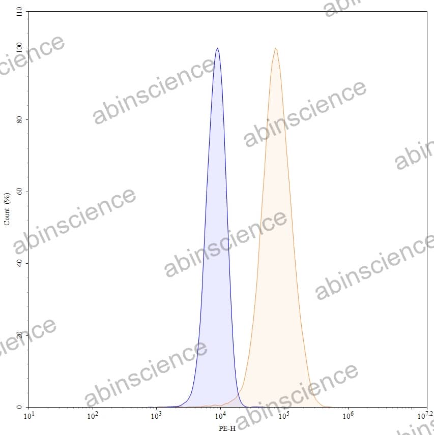 Flow-cytometry using PE anti-human CSF1 antibody. MG-63 cells were fixed and permeabilized, then stained with an irrelevant antibody (Blue Histogram) or an PE anti-human CSF1 monoclonal antibody (Catalog: HY515127, Yellow Histogram) at a concentration of 5 µg/ml for 30 mins at RT. After washing, cells analysed on a NovoCyte Flow Cytometer. |