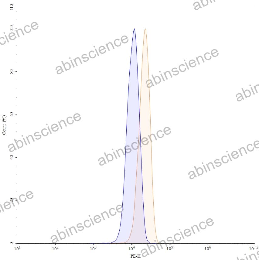Flow-cytometry using PE anti-human CD140b antibody. MG-63 cells were fixed and permeabilized, then stained with an irrelevant antibody (Blue Histogram) or an PE anti-human CD140b monoclonal antibody (Catalog: HY260127, Yellow Histogram) at a concentration of 5 µg/ml for 30 mins at RT. After washing, cells analysed on a NovoCyte Flow Cytometer. |