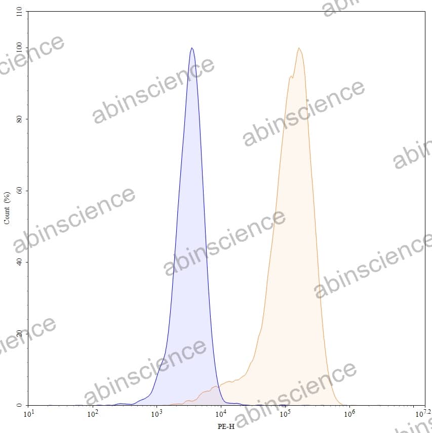 Flow-cytometry using PE anti-human CD117 antibody. HEL cells were stained with an irrelevant antibody (Blue Histogram) or an PE anti-human CD116 monoclonal antibody (Catalog: HY163127, Yellow Histogram) at a concentration of 5 µg/ml for 30 mins at RT. After washing, and cells analysed on a NovoCyte Flow Cytometer. |