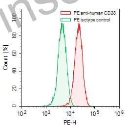 Flow-cytometry using PE anti-human CD28 antibody. RPMI-8226 cells were stained with an irrelevant antibody (Green Histogram) or a PE anti-human CD28 antibody monoclonal antibody (Catalog # HY422227, Red Histogram) at a concentration of 5 µg/ml for 30 mins at RT. After washing, cells analysed on a NovoCyte Flow Cytometer. |