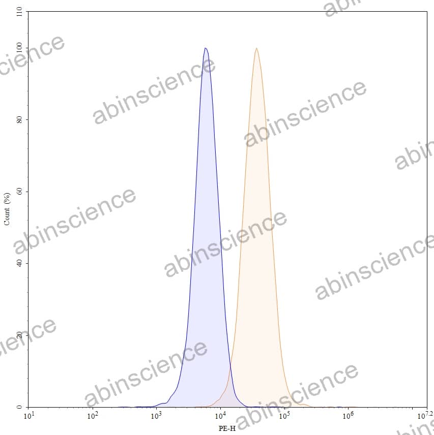 Flow-cytometry using PE anti-human CD222 antibody. HepG-2 cells were fixed and permeabilized, then stained with an irrelevant antibody (Blue Histogram) or an PE anti-human CD222 monoclonal antibody (Catalog: HY282127, Yellow Histogram) at a concentration of 5 µg/ml for 30 mins at RT. After washing, cells analysed on a NovoCyte Flow Cytometer. |