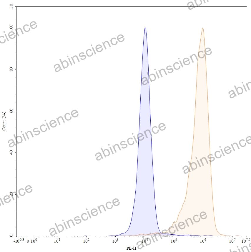 Flow-cytometry using PE anti-human FOLR1 antibody. Hela cells were stained with an irrelevant antibody (Blue Histogram) or an PE anti-human FOLR1 monoclonal antibody (Catalog: HB825327, Yellow Histogram) at a concentration of 5 µg/ml for 30 mins at RT. After washing, and cells analysed on a NovoCyte Flow Cytometer. |