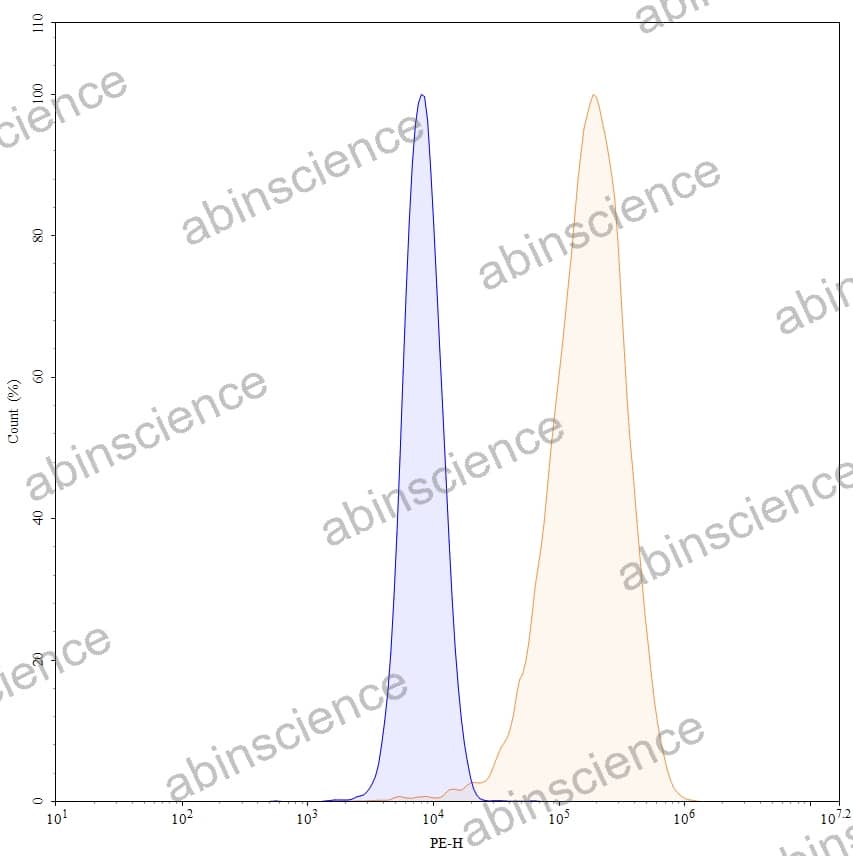 Flow-cytometry using PE anti-human CD140a antibody. MG-63 cells were stained with an irrelevant antibody (Blue Histogram) or an PE anti-human CD140a monoclonal antibody (Catalog: HB927227, Yellow Histogram) at a concentration of 5 µg/ml for 30 mins at RT. After washing, and cells analysed on a NovoCyte Flow Cytometer. |