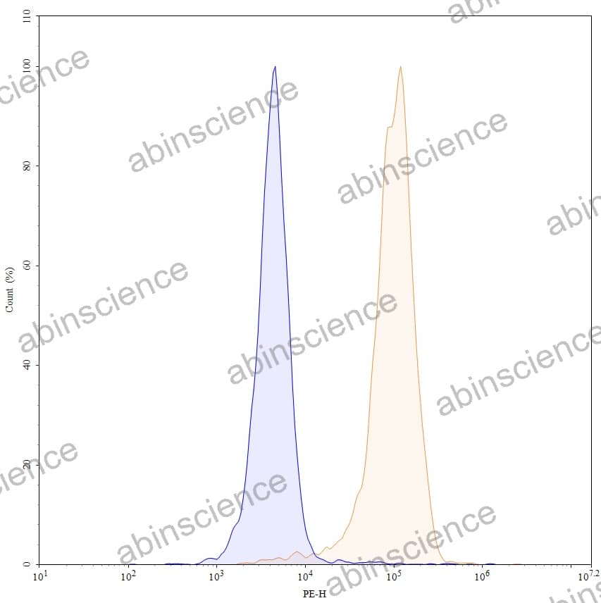 Flow-cytometry using PE anti-human CD49b antibody. HUVEC cells were stained with an irrelevant antibody (Blue Histogram) or an PE anti-human CD49b monoclonal antibody (Catalog: HB772127, Yellow Histogram) at a concentration of 5 µg/ml for 30 mins at RT. After washing, cells analysed on a NovoCyte Flow Cytometer. |