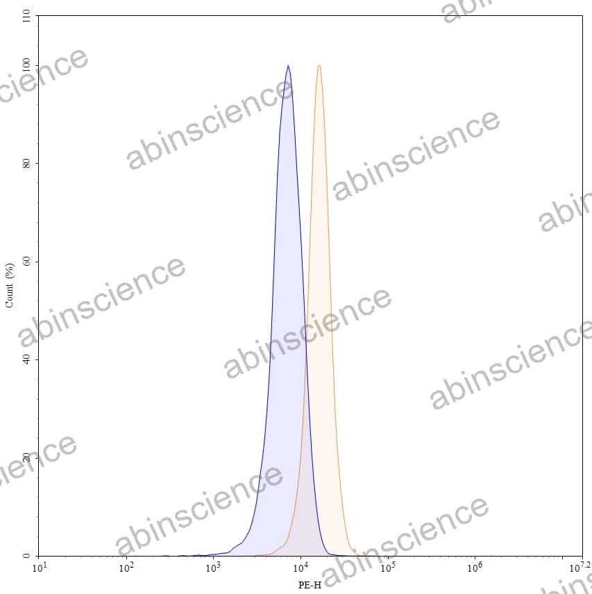 | Flow-cytometry using PE anti-human CD252 antibody. HUVEC cells were fixed and permeabilized, then stained with an irrelevant antibody (Blue Histogram) or an PE anti-human CD252 monoclonal antibody (Catalog: HB937327, Yellow Histogram) at a concentration of 5 µg/ml for 30 mins at RT. After washing, cells analysed on a NovoCyte Flow Cytometer. |