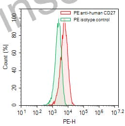Flow-cytometry using PE anti-human CD27 antibody. Raji cells were stained with an irrelevant antibody (Green Histogram) or a PE anti-human CD27 antibody monoclonal antibody (Catalog # HB796127, Red Histogram) at a concentration of 5 µg/ml for 30 mins at RT. After washing, cells analysed on a NovoCyte Flow Cytometer. |