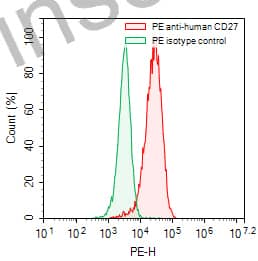 Flow-cytometry using PE anti-human CD27 antibody. Raji cells were stained with an irrelevant antibody (Green Histogram) or a PE anti-human CD27 antibody monoclonal antibody (Catalog # HB796227, Red Histogram) at a concentration of 5 µg/ml for 30 mins at RT. After washing, cells analysed on a NovoCyte Flow Cytometer. |