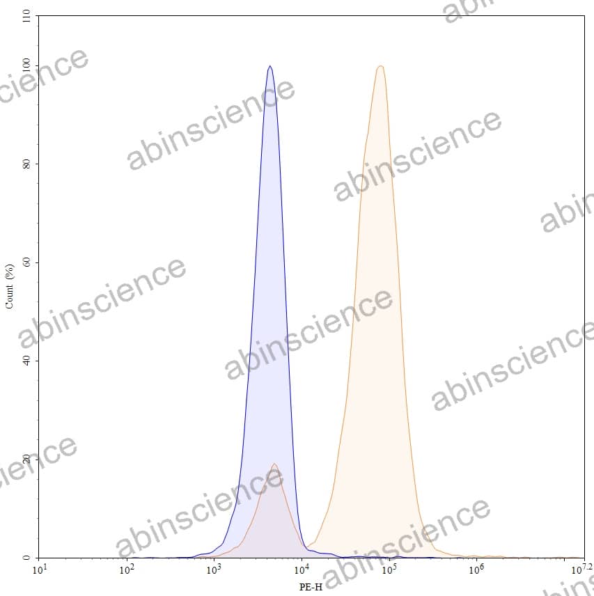 Flow-cytometry using PE anti-human AXL antibody. Hela cells were stained with an irrelevant antibody (Blue Histogram) or an PE anti-human AXL monoclonal antibody (Catalog: HB709227, Yellow Histogram) at a concentration of 5 µg/ml for 30 mins at RT. After washing, and cells analysed on a NovoCyte Flow Cytometer. |
