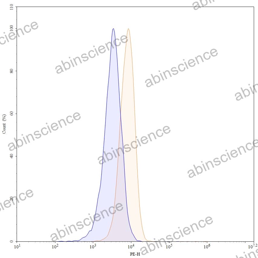 Flow-cytometry using PE anti-human CD32b antibody. Raji cells were stained with an irrelevant antibody (Blue Histogram) or an PE anti-human CD32b monoclonal antibody (Catalog: HB103227, Yellow Histogram) at a concentration of 5 µg/ml for 30 mins at RT. After washing, cells analysed on a NovoCyte Flow Cytometer. |