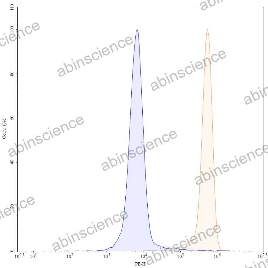 | Flow-cytometry using PE anti-human CD147 antibody. Hela cells were stained with an irrelevant antibody (Blue Histogram) or an PE anti-human CD147 monoclonal antibody (Catalog: HW664127, Yellow Histogram) at a concentration of 5 µg/ml for 30 mins at RT. After washing, and cells analysed on a NovoCyte Flow Cytometer. |
