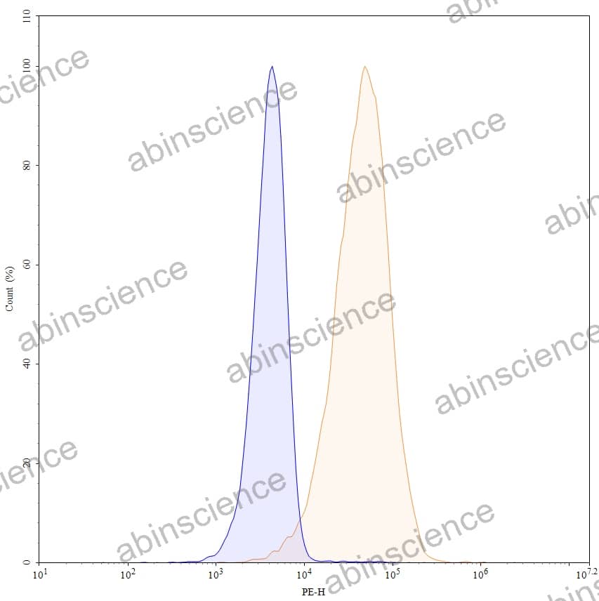 Flow-cytometry using PE anti-human CD146 antibody. Hela cells were stained with an irrelevant antibody (Blue Histogram) or an PE anti-human CD146 monoclonal antibody (Catalog: HW484227, Yellow Histogram) at a concentration of 5 µg/ml for 30 mins at RT. After washing, and cells analysed on a NovoCyte Flow Cytometer. |