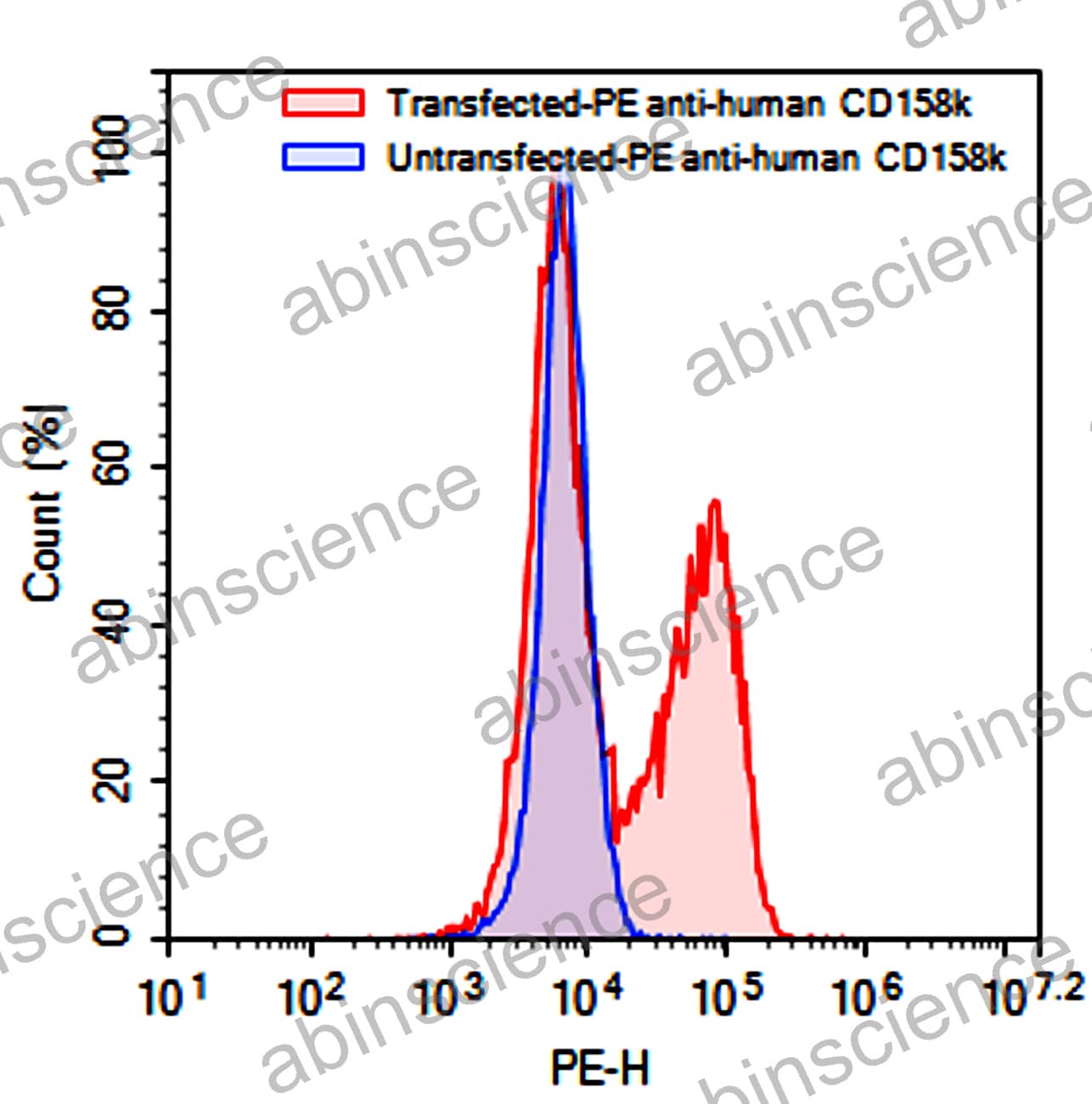 Flow-cytometry using PE anti-human CD158k antibody. Untransfected (Blue Histogram) or Transfected 293T cells (Red Histogram) were stained with a PE anti-human CD158k antibody monoclonal antibody (Catalog # HW633127) at a concentration of 5 µg/ml for 30 mins at RT. After washing, cells analysed on a NovoCyte Flow Cytometer.