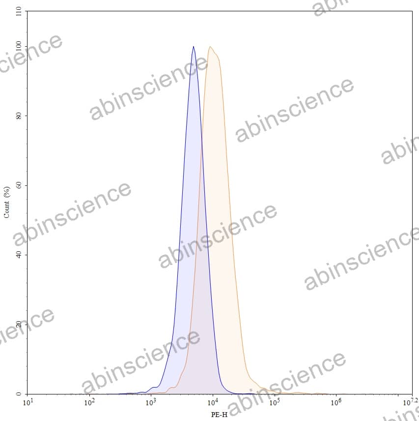 Flow-cytometry using PE anti-human CXCL12 antibody. HepG-2 cells were fixed and permeabilized, then stained with an irrelevant antibody (Blue Histogram) or an PE anti-human CXCL12 monoclonal antibody (Catalog: HW376127, Yellow Histogram) at a concentration of 5 µg/ml for 30 mins at RT. After washing, cells analysed on a NovoCyte Flow Cytometer. |