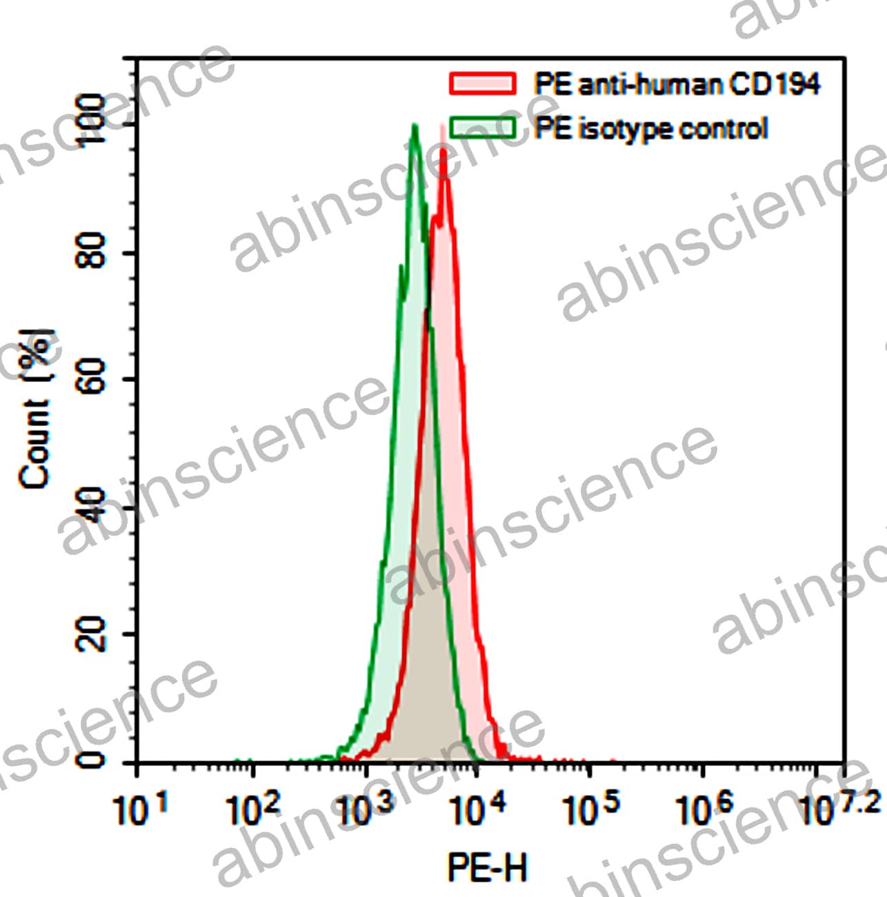Flow-cytometry using PE anti-Human CD194 antibody. HDLM-2 cells were stained with an irrelevant antibody (Green Histogram) or a PE anti-Human CD194 antibody monoclonal antibody (Catalog # HW634127 , Red Histogram) at a concentration of 5 µg/ml for 30 mins at RT. After washing, cells analysed on a NovoCyte Flow Cytometer.
